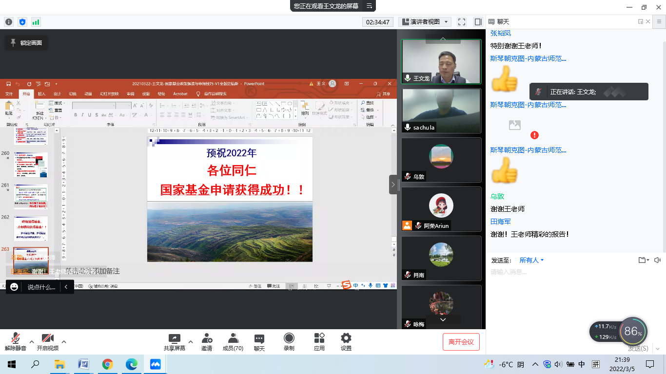 2022年3月5日,地理科学学院邀请了中国科学院水利部水土保持研究所王文龙研究员,为我院教师分享国家自然科学基金政策的新变化以及申请书的撰写技巧。讲座采用腾讯会议方式进行,由副院长萨楚拉老师主持,书记张裕凤、院长包玉海及近70名老师和博士研究生听取了报告。