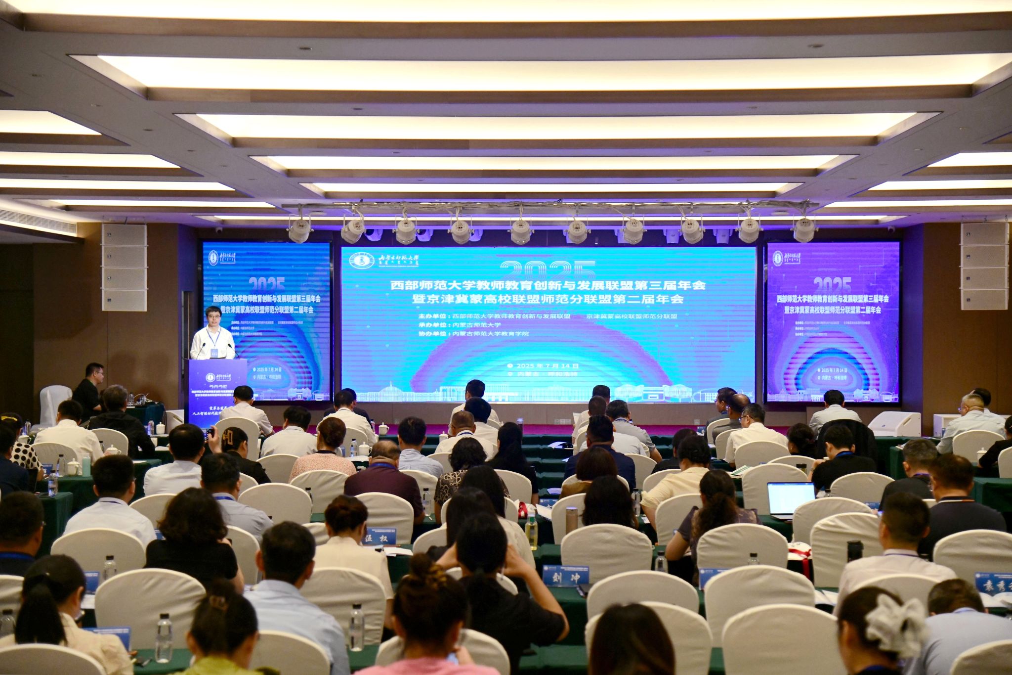 本网讯 为深入贯彻党的二十大精神,全面落实中共中央、国务院《教育强国建设规划纲要(2024—2035)》,纵深实施教育数字化战略行动,深化西部师范教育协同发展新格局,强化京津冀蒙教育协作共同体建设,7月14日,由西部师范大学教师教育创新与发展联盟和京津冀蒙高校联盟师范分联盟主办、我校承办的西部师范大学教师教育创新与发展联盟第三届年会暨京津冀蒙高校联盟师范分联盟第二届年会在呼和浩特市举办。我校党委书记李树林,陕西师范大学党委书记李晓兵,河北师范大学党委常委、副校长曾智安,兴义民族师范学院校长张乾飞,自治区教育厅二级巡视员武秀珍出席会议并致辞。来自全国50余所高校的200余位代表参加会议。我校党委副书记、校长张军主持开幕式。