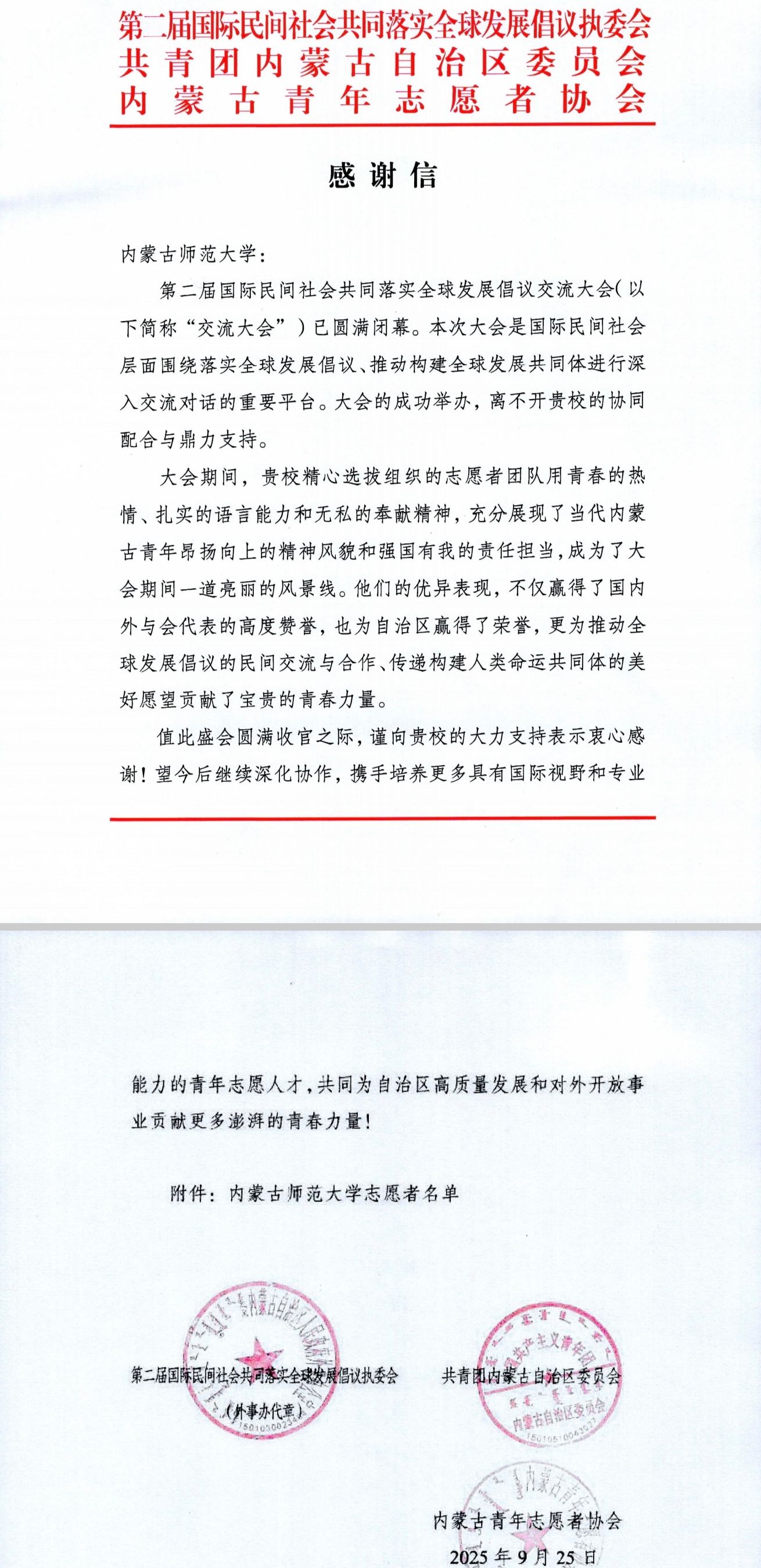 9月9日至11日,第二届国际民间社会共同落实全球发展倡议交流大会在呼和浩特市召开。内蒙古师范大学.第七版入口网页外国语学院英语系选派了14名师生参与大会志愿服务。大会期间,志愿者们以高度的责任感和专业的服务水准,承担了来宾引导接待、会议现场服务、多语种翻译支持等环节工作,有力支持了大会各项议程的顺利进行,赢得了国内外与会代表的广泛赞誉。